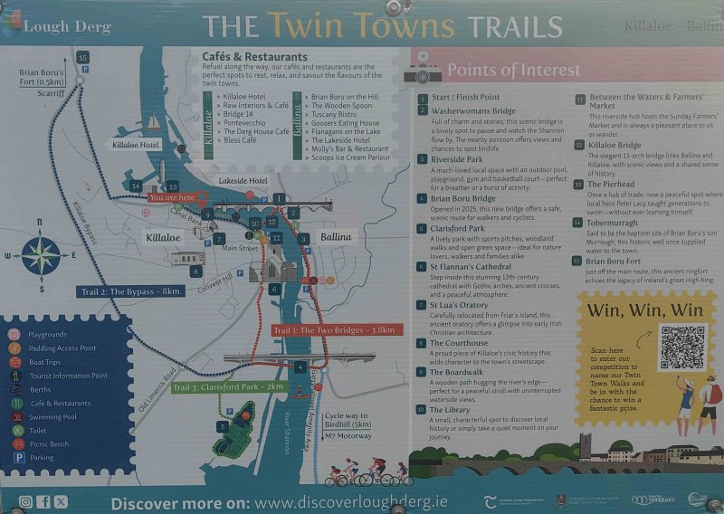 La mattina successiva ci siamo svegliati presto e abbiamo deciso di fare una passeggiata a Killaloe. Era una domenica mattina e il paese era deserto: un’atmosfera tranquilla e silenziosa che ci ha fatto apprezzare ancora di più il fascino del borgo. Seguendo le indicazioni di un cartello turistico abbiamo scoperto i Twin Town Trails, una serie di percorsi che collegano Killaloe a Ballina. Abbiamo scelto un breve itinerario: circa un’ora di camminata, qualche chilometro immersi tra stradine, viste sul fiume Shannon e scorci caratteristici.
