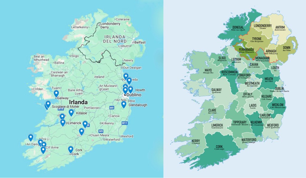 - L’area metropolitana di Galway (oltre 120.000 abitanti) è più vicina per dimensioni a Vicenza (circa 110.000) o Padova città (circa 210.000, quindi un po’ più grande)