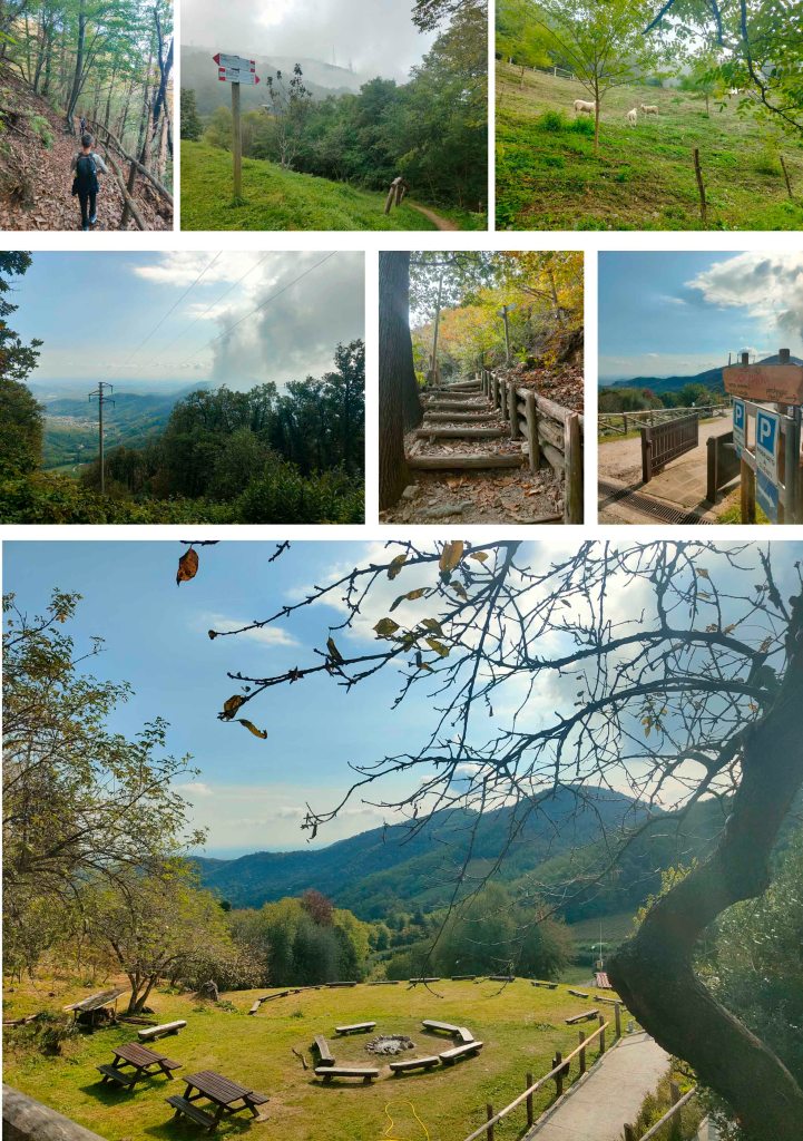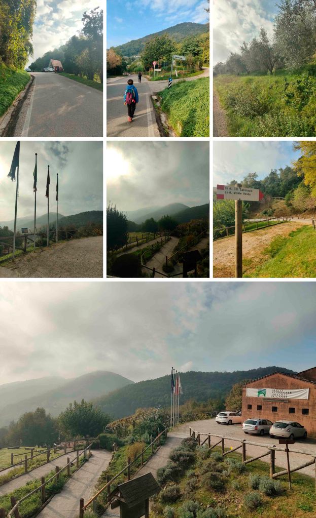 Il cammino inizia con una salita dolce ma costante, immersa nel bosco. Il terreno alterna sterrato compatto, tratti di sentiero roccioso e zone più morbide coperte di foglie, tipiche della stagione autunnale. Alcune salite presentano brevi tratti ripidi ma ben affrontabili anche in famiglia, con scarpe da trekking e bastoncini.
